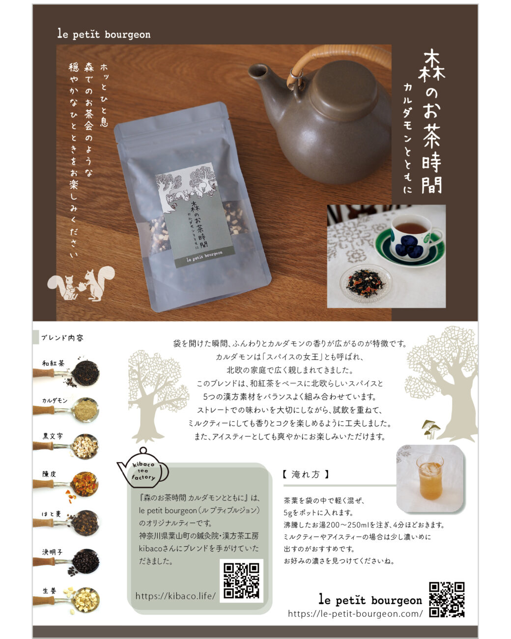 「森のお茶時間 カルダモンとともに」は和紅茶をベースに、北欧で親しまれているスパイス・カルダモンをきかせ、そして5種類の漢方素材を贅沢にブレンドしました。心にやさしく寄り添う一杯として、ゆったりとしたお茶時間を楽しんでいただけますように。