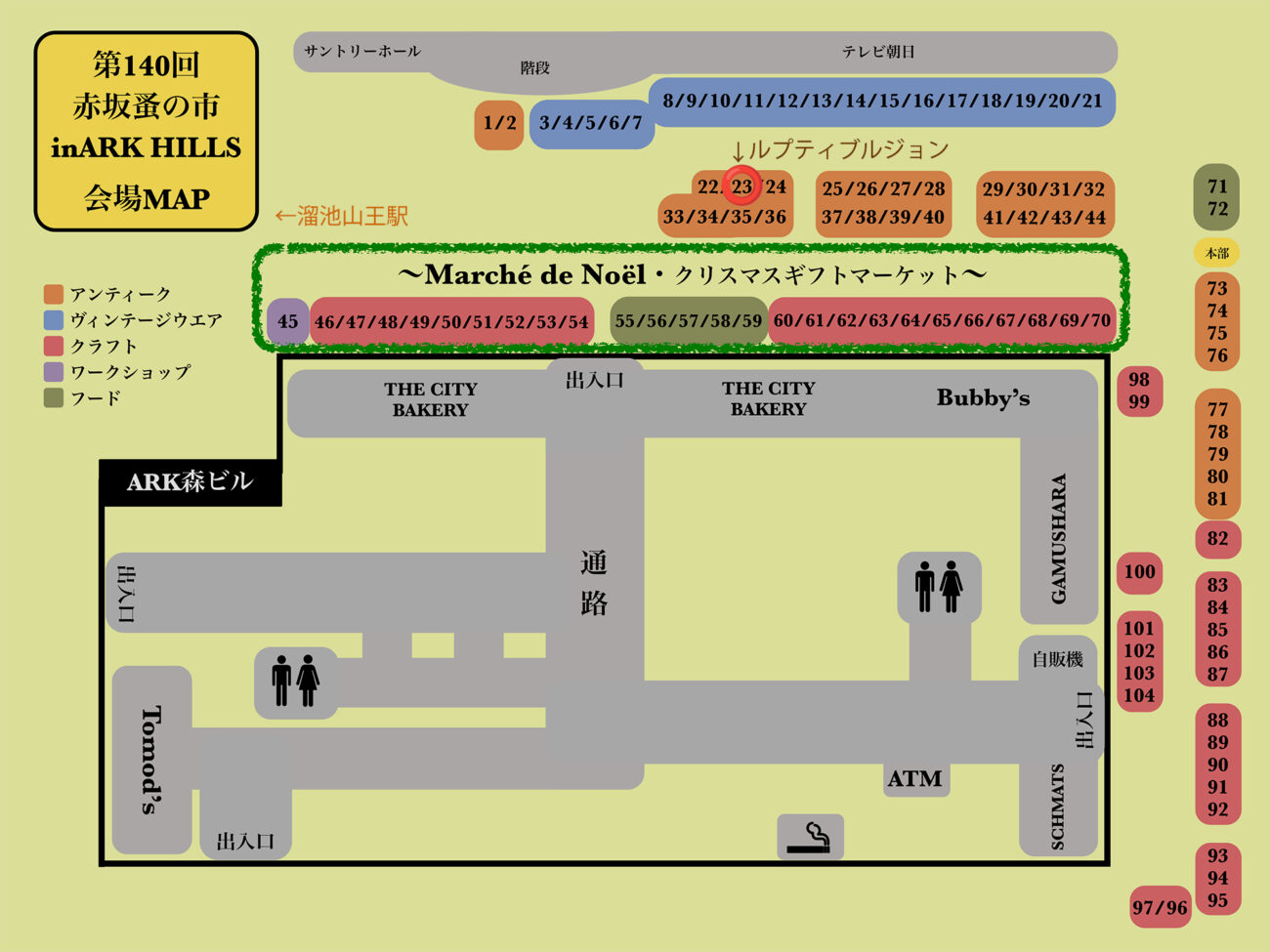 ブース番号は23番です。溜池山王駅から来ると、左手通路を進んだあたりになります。今回はクラフトのクリスマスマーケットもありますので、どうぞお楽しみに!